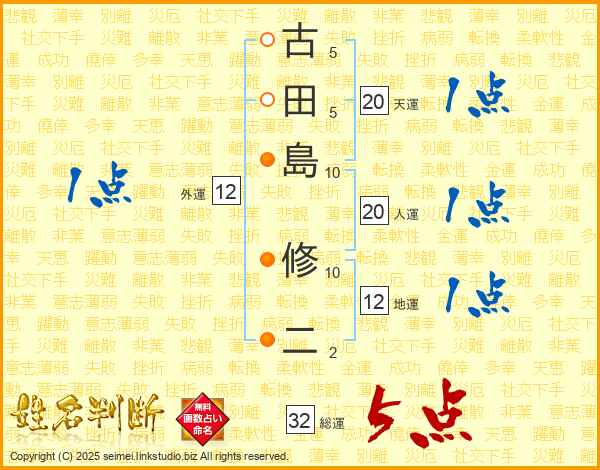 古(5画)田(5画)島(10画) 修(10画)二(2画)