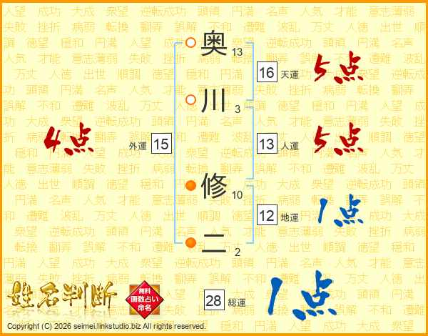 あなたの人生を表す1番重要な運勢です。生涯を通じて影響する総合運となり、主に50歳以降の晩年期に影響を及ぼします。苗字と名前の合計画数。