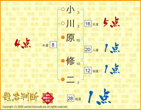 小(3画)川(3画)原(10画) 修(10画)二(2画)