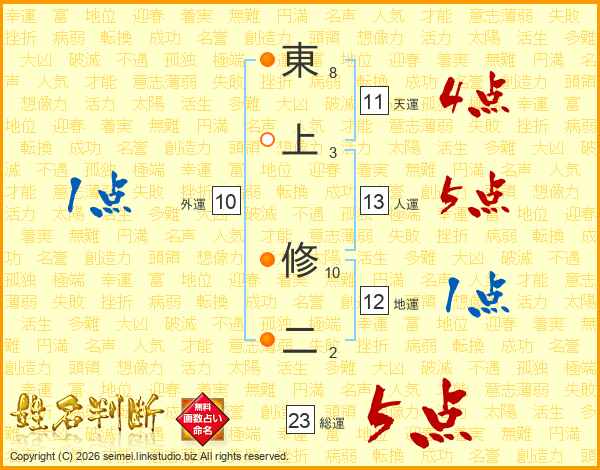 生活面を象徴する運勢です。外部から受ける影響力を表し、結婚運、家庭運や職場、環境への順応性を表します。総運から人運を引いた画数。姓や名が1文字の場合を除く。