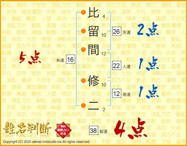 比(4画)留(10画)間(12画) 修(10画)二(2画)