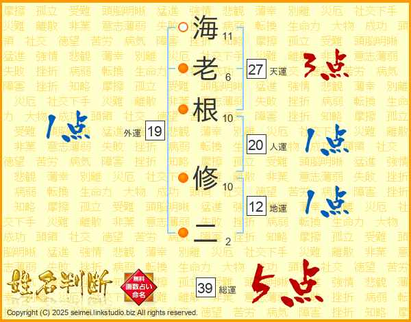 海(11画)老(6画)根(10画) 修(10画)二(2画)