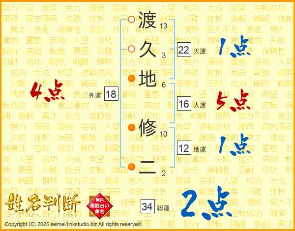 渡(13画)久(3画)地(6画) 修(10画)二(2画)