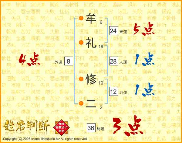 牟(6画)礼(18画) 修(10画)二(2画)