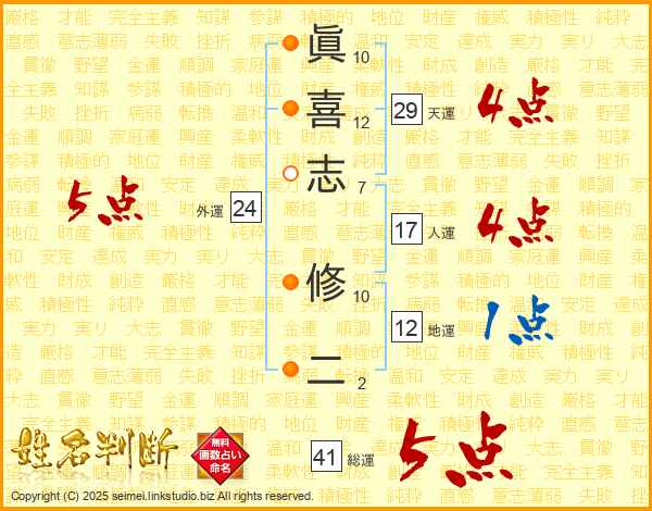 眞(10画)喜(12画)志(7画) 修(10画)二(2画)