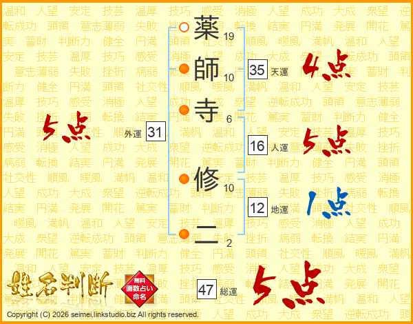 薬(19画)師(10画)寺(6画) 修(10画)二(2画)