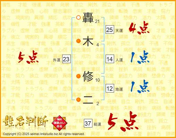 生活面を象徴する運勢です。外部から受ける影響力を表し、結婚運、家庭運や職場、環境への順応性を表します。総運から人運を引いた画数。姓や名が1文字の場合を除く。