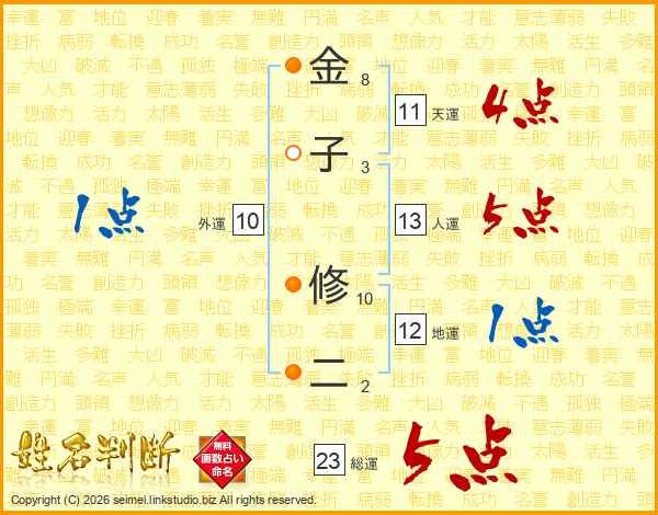 金(8画)子(3画) 修(10画)二(2画)