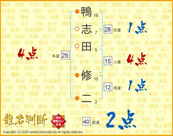 鴨(16画)志(7画)田(5画) 修(10画)二(2画)