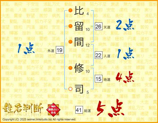 比(4画)留(10画)間(12画) 修(10画)司(5画)