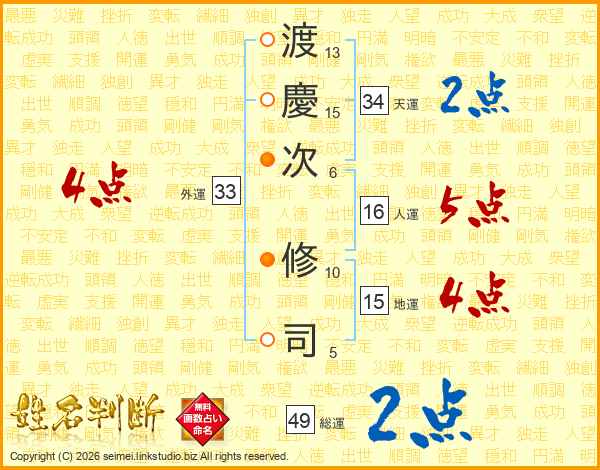 渡(13画)慶(15画)次(6画) 修(10画)司(5画)