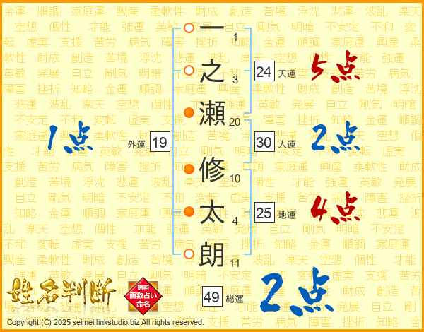 一(1画)之(3画)瀬(20画) 修(10画)太(4画)朗(11画)