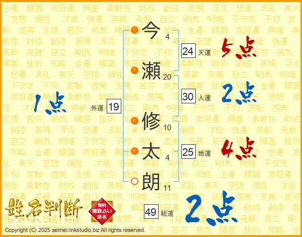 今(4画)瀬(20画) 修(10画)太(4画)朗(11画)