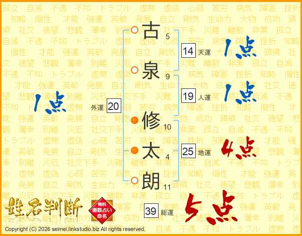 古(5画)泉(9画) 修(10画)太(4画)朗(11画)