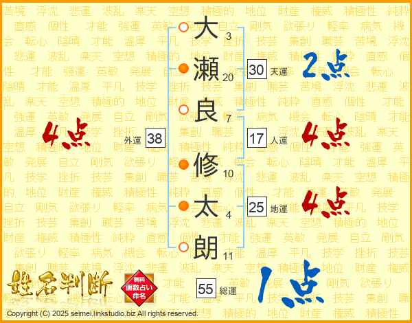 大(3画)瀬(20画)良(7画) 修(10画)太(4画)朗(11画)
