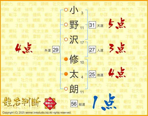 小(3画)野(11画)沢(17画) 修(10画)太(4画)朗(11画)
