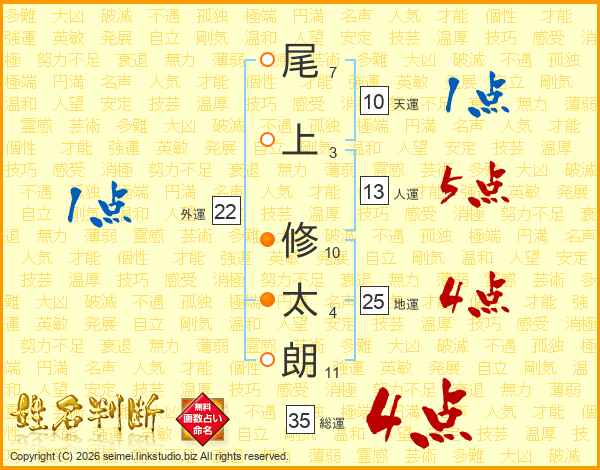 尾(7画)上(3画) 修(10画)太(4画)朗(11画)