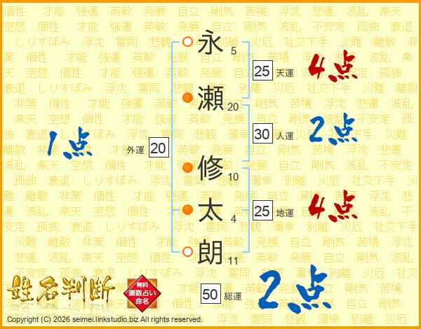 永(5画)瀬(20画) 修(10画)太(4画)朗(11画)