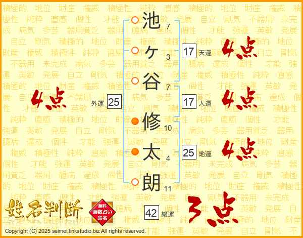 池(7画)ヶ(3画)谷(7画) 修(10画)太(4画)朗(11画)