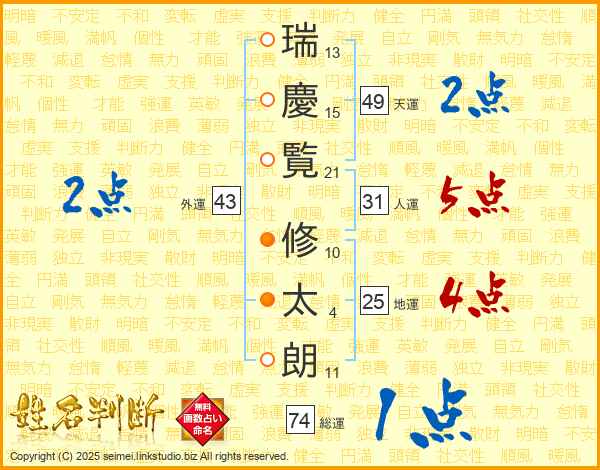瑞(13画)慶(15画)覧(21画) 修(10画)太(4画)朗(11画)