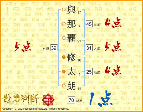 與(17画)那(7画)覇(21画) 修(10画)太(4画)朗(11画)