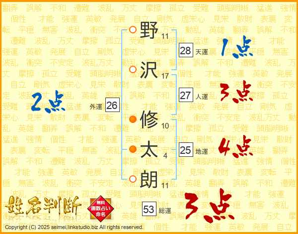 野(11画)沢(17画) 修(10画)太(4画)朗(11画)