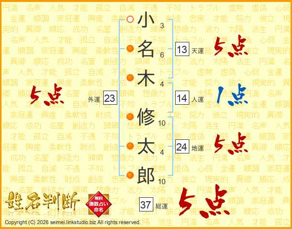 小名木修太郎さんの総運は37画の5点!