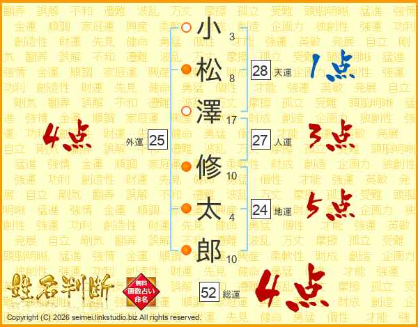小(3画)松(8画)澤(17画) 修(10画)太(4画)郎(10画)