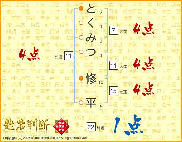 とくみつ修平さんの総運は22画の1点!