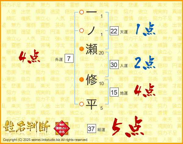 一(1画)ノ(1画)瀬(20画) 修(10画)平(5画)
