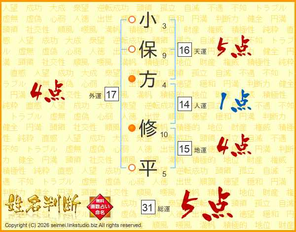 生活面を象徴する運勢です。外部から受ける影響力を表し、結婚運、家庭運や職場、環境への順応性を表します。総運から人運を引いた画数。姓や名が1文字の場合を除く。