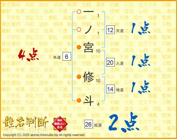 一(1画)ノ(1画)宮(10画) 修(10画)斗(4画)