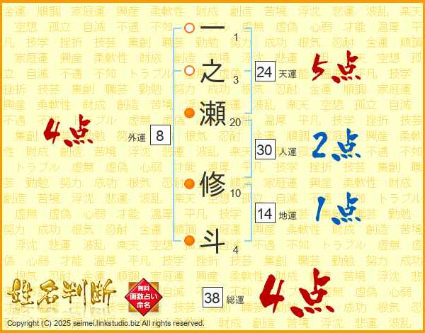 一之瀬修斗さんの総運は38画の4点!