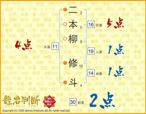 あなたの人生を表す1番重要な運勢です。生涯を通じて影響する総合運となり、主に50歳以降の晩年期に影響を及ぼします。苗字と名前の合計画数。