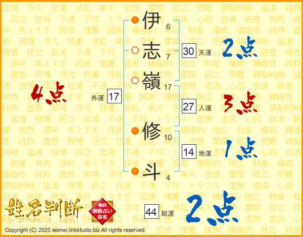 伊(6画)志(7画)嶺(17画) 修(10画)斗(4画)