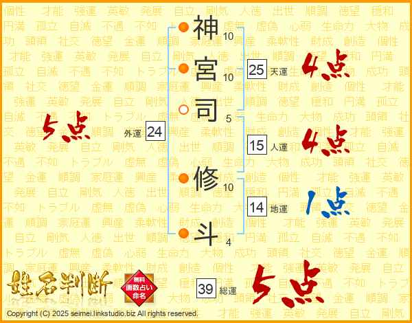 神宮司修斗さんの総運は39画の5点!