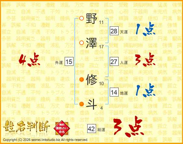 野(11画)澤(17画) 修(10画)斗(4画)