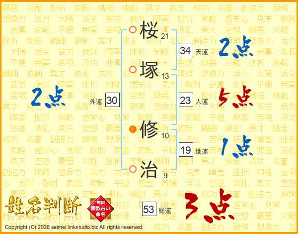 桜(21画)塚(13画) 修(10画)治(9画)