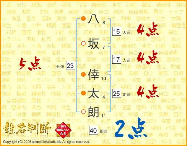 八(8画)坂(7画) 倖(10画)太(4画)朗(11画)