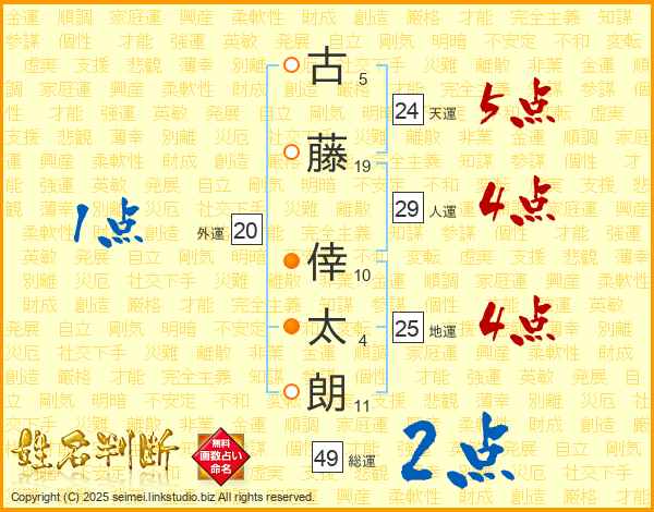 古(5画)藤(19画) 倖(10画)太(4画)朗(11画)