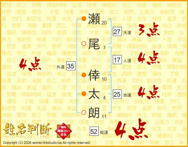 瀬(20画)尾(7画) 倖(10画)太(4画)朗(11画)