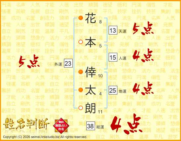 花(8画)本(5画) 倖(10画)太(4画)朗(11画)