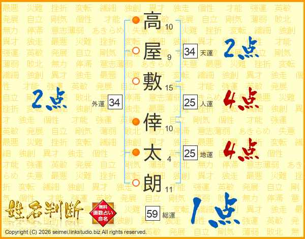 高(10画)屋(9画)敷(15画) 倖(10画)太(4画)朗(11画)