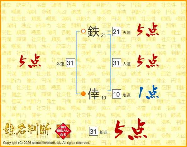 生活面を象徴する運勢です。外部から受ける影響力を表し、結婚運、家庭運や職場、環境への順応性を表します。総運から人運を引いた画数。姓や名が1文字の場合を除く。