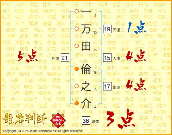 一(1画)万(13画)田(5画) 倫(10画)之(3画)介(4画)