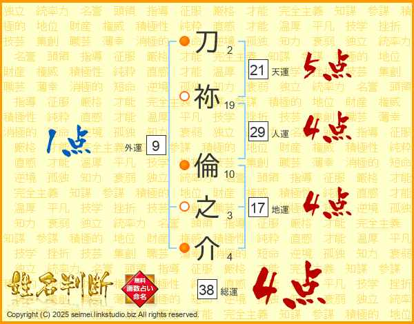 刀(2画)祢(19画) 倫(10画)之(3画)介(4画)