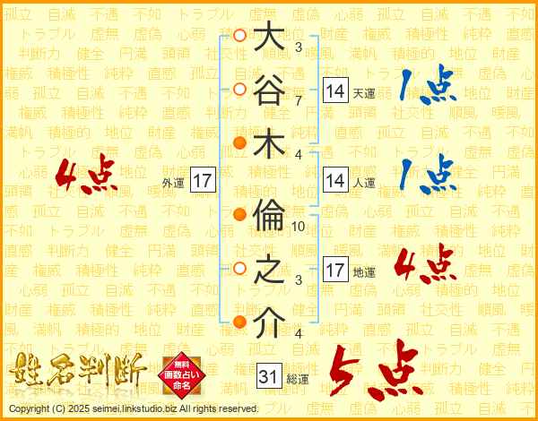 大(3画)谷(7画)木(4画) 倫(10画)之(3画)介(4画)