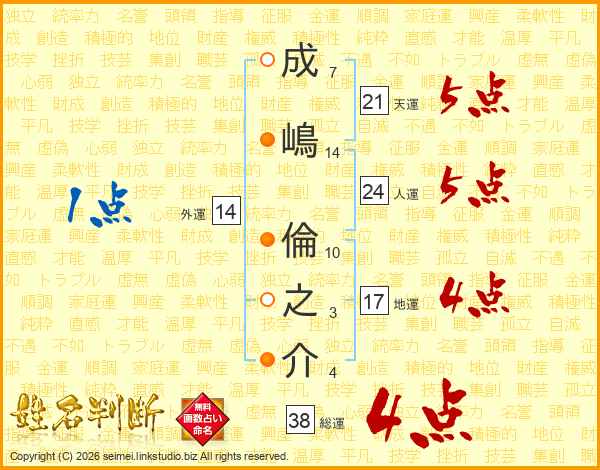 成(7画)嶋(14画) 倫(10画)之(3画)介(4画)