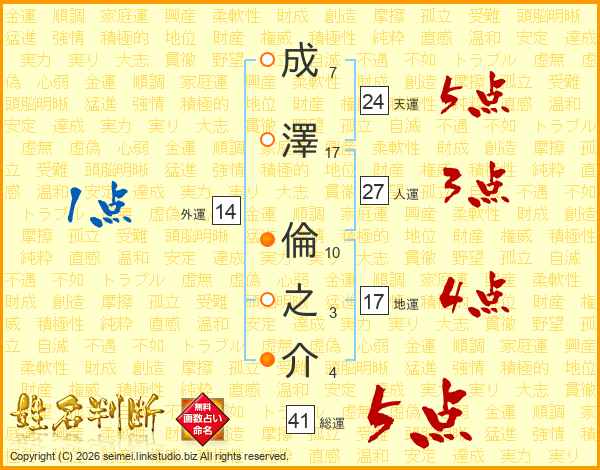 成(7画)澤(17画) 倫(10画)之(3画)介(4画)