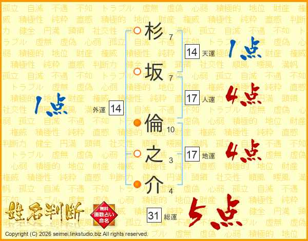 杉(7画)坂(7画) 倫(10画)之(3画)介(4画)
